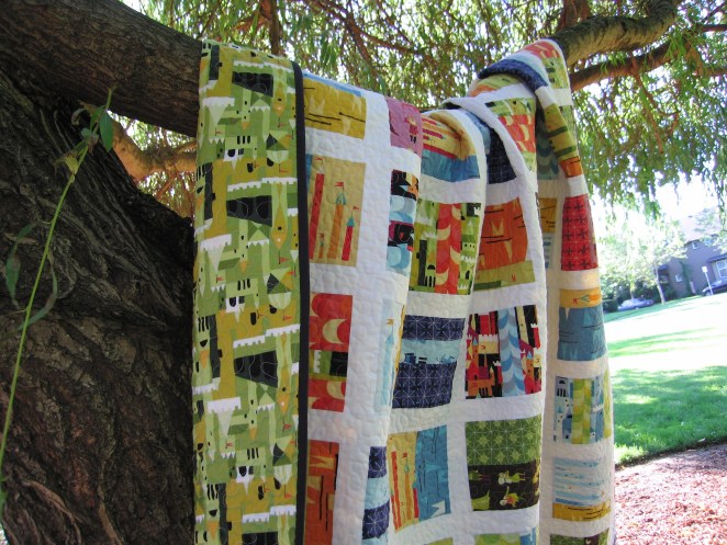 Is it possible to lust after another person’s finished quilt? Yes, quite possibly. Definitely. For sure. The quilt shown above uses the Castle Peeps line, and was put together by Elizabeth Hartman, of Oh! Fransson. I purchased the blue colorway of this line this summer and before I close out my sewing blitz and focus on The Job, I’m dying to throw together one more quilt. This design has inspired me.