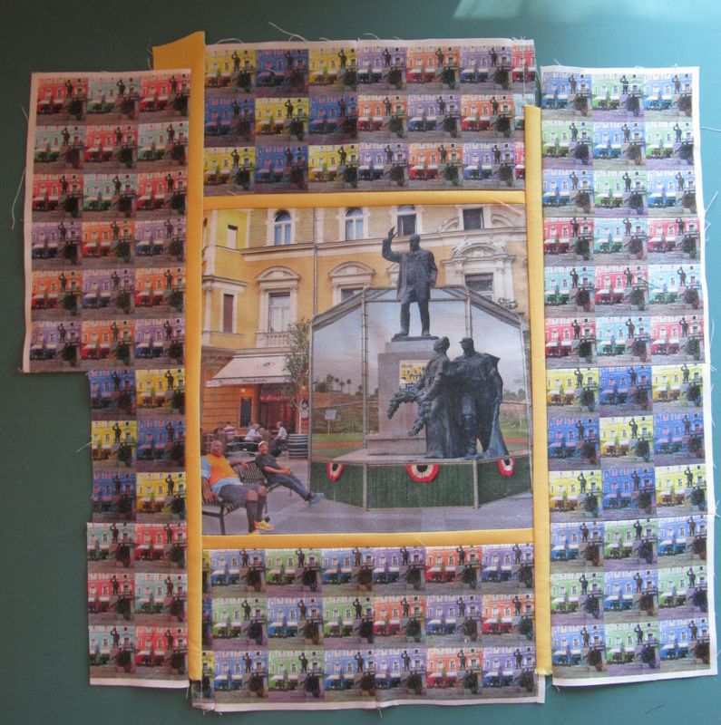 In yesterday’s post, I talked about how I created my art conceptually, but what I did technically was begin with a good photo of the square in Budapest. I overlaid the baseball backstop photo, sized it, then took it down to 20% transparency, and used the Eraser tool to start erasing a space to let the statuary shine through. I could have created a Path and selected it, but sometimes I think the Erase Tool does just fine. I did change out the size of brush I was using, from 1 pixel in some places to 75 pixels in other places. I did the same with Ted and Maurice, first flipping them around so they faced the other way, as that’s where I had some space to put them. I merged the layers, as I know from experience that when printing on fabric, it’s wise to pump up the Saturation of colors (enhancing the image without making it garish), and to Lighten/Brighten the entire image.