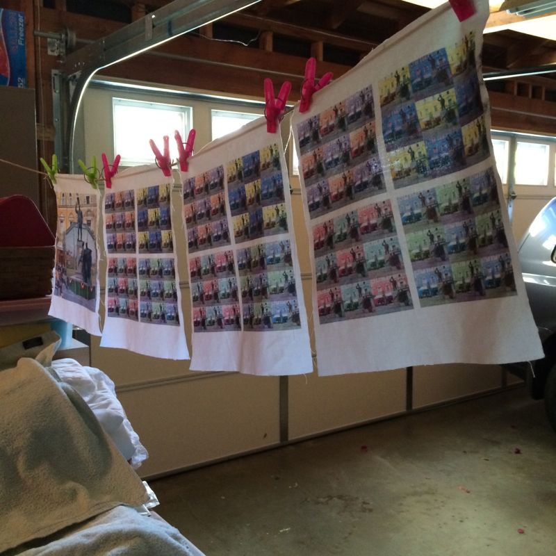 I lay down some towels underneath my improvised clothesline in the garage (some say you can put containers to catch the extra drips, but I didn’t have that much excess) and hung up my sheets of fabric until dry. In our summer heat, it only took about an hour. Meanwhile, I washed and thoroughly dried my container, and when the fabric was dry, put them in the container until I could get to them. I read one blog where the crafter cautioned about letting too much time pass between treatment and printing. I had a space of about 4 days, and that was fine.