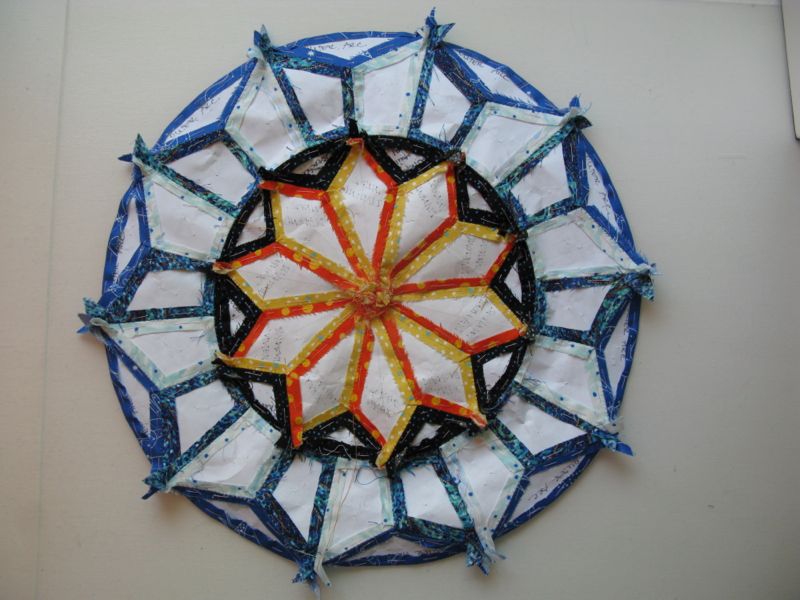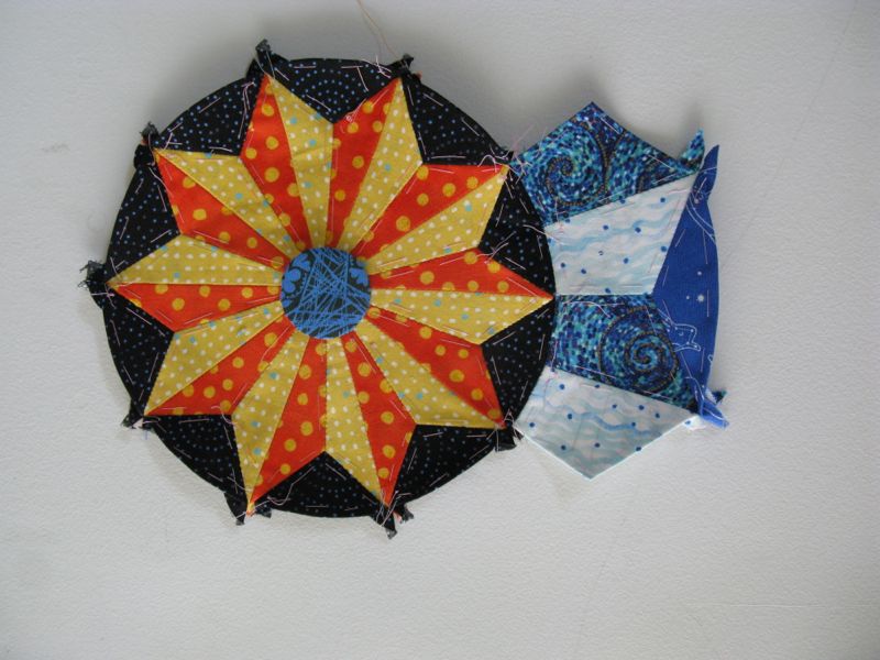 Oh What a Mess EPP_3Still a mess even though I sewed on the outer arcs.  What was needed was a design change, like adding the center circle to the design.  Even though the fine artists in Slovenia can paint the center of the circle to a distinct point doesn’t mean that fabric will allow us to do that.