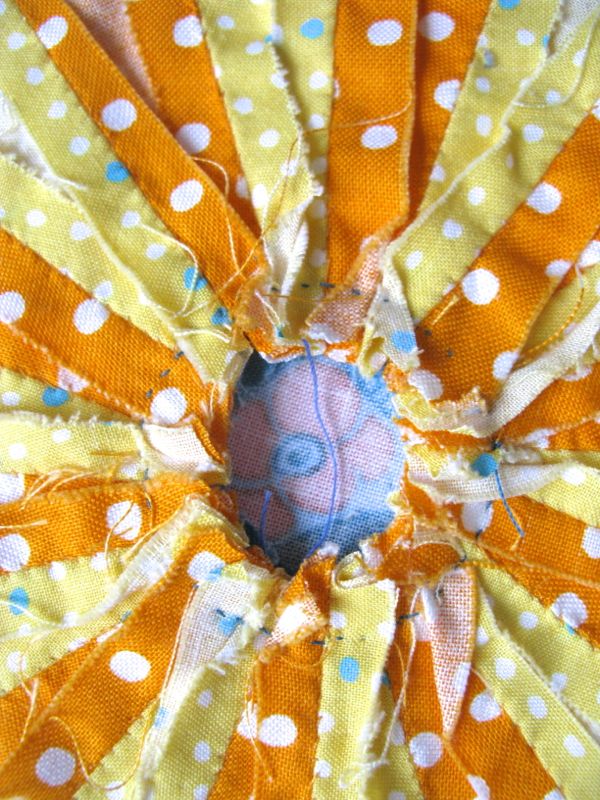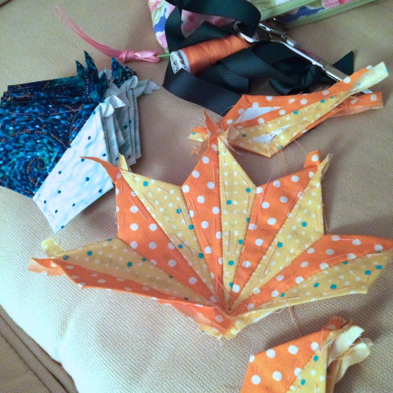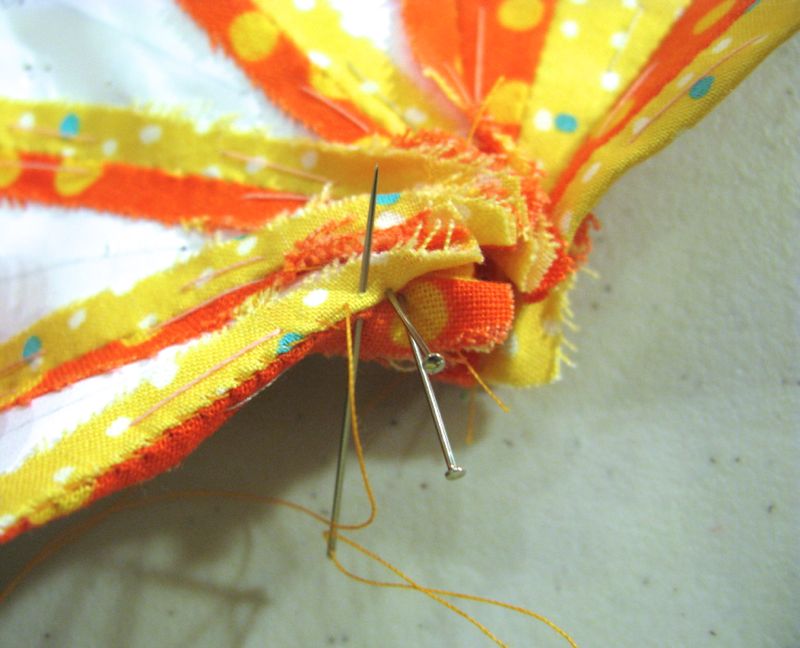 I stitch the left and the right sides together into groups of two. I have done this next part two ways.  One way is to sew groups of two onto the inner circle (you see them above in the background), then afterwards stitch the sides of those together.  Another way is to sew all the two-part shapes into a large circle, then attach that.  I use pins to keep the intersections lined up.