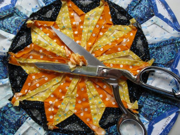 After stitching the circle on, trim out the backing, leaving a quarter-inch seam allowance, then take out any remaining papers.
