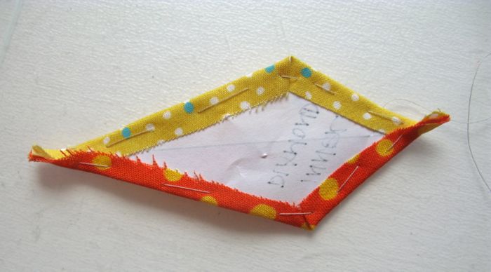 If the pieces have a certain direction or shape and I want to reproduce the picture above exactly, place the paper with the printing FACE DOWN on the fabric, then pin.