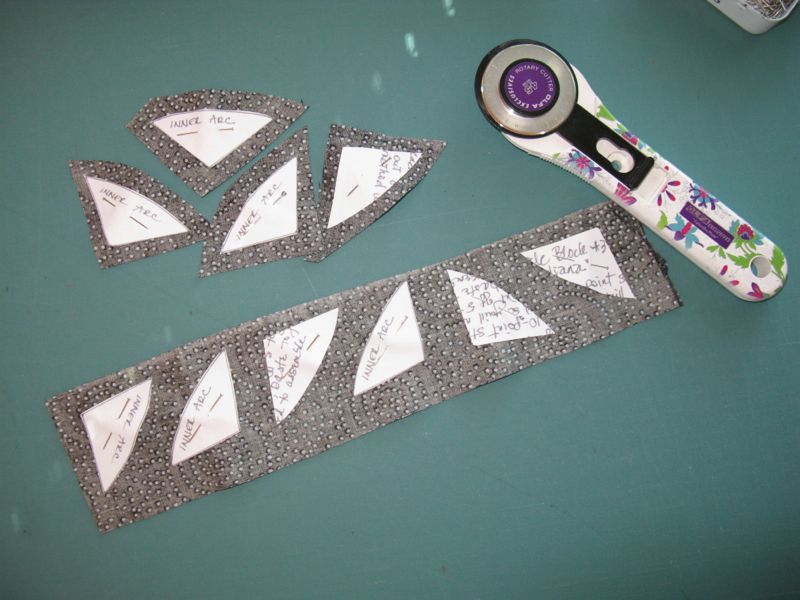 If the pieces don’t matter (like the symmetrical small arc, above), you can place the pieces either printing UP or printing DOWN, or a mix.  I don’t care, nor should you. Notice that I just curve around them with my rotary cutter, as you don’t have to be so precise on that quarter-inch seam allowance for English Paper Piecing (EPP).  Just get sort of close to that quarter-inch, but not less than.  I pin through each of my pieces, then I fold over the seam allowances a side at a time and baste them down with that icky thread from the back of my sewing box.  (I’ve got to use it up somehow.)  I make sure the beginning knot and the ending tail are on TOP of the piece, not on the paper side.  This is good stuff to do while you watch  television.