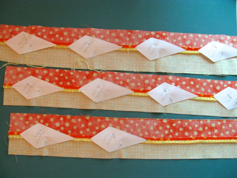 First seam together on your sewing machine the two fabrics for the diamond, then cut apart into segments (below).