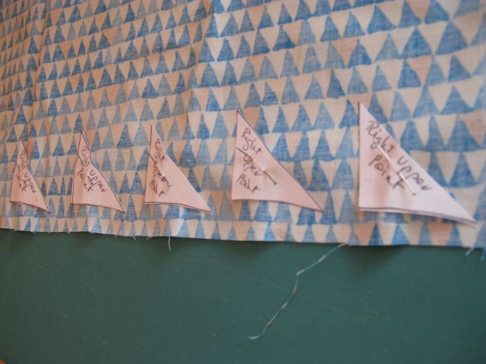 This is my attempt to figure out if I wanted the blue-triangle fabric over the green, or over the yellow.  I try out my combinations as I go.  I’m spending a lot of time sewing this and I want to like it when I’m finished.