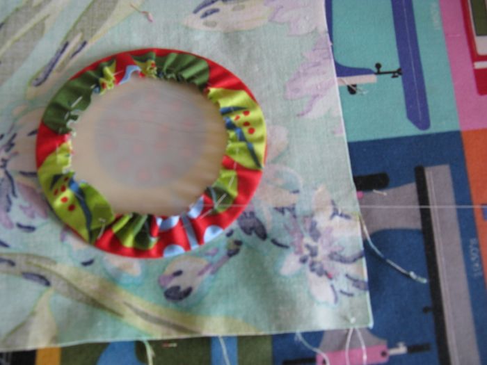 I slip in my cardboard or plastic circle template, then lightly press it, pulling that thread taut to draw the gathers up around the circle.