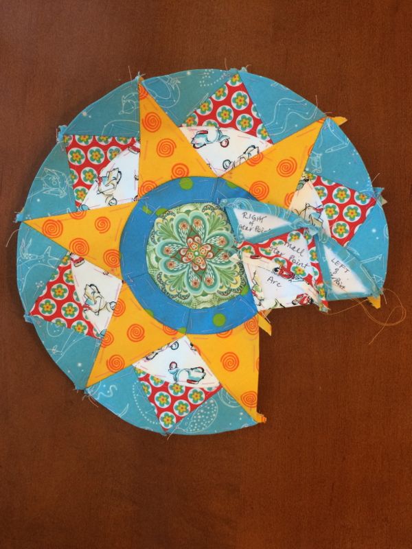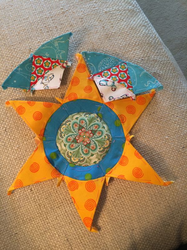 I did this circle in three different states at five different houses and a hospital room.  EPP travels very well.  Here I have stitched the ring pieces together, sometimes attaching them to the circle as I go.  Now I’m starting to attach the star points.  I think it looks like a clown hat at this juncture.