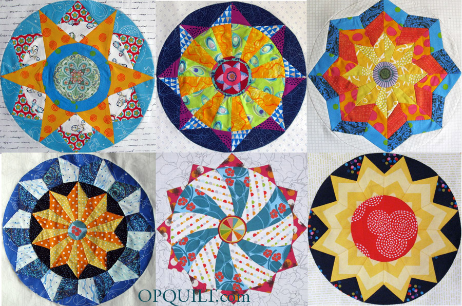 This sixth circle, based on a six-pointed star, is all English Paper-Pieced, except that I do appliqué the larger circle onto the background square, as the results are better that way.  And since this center circle does not need go over a series of joining seams, it can be paper-pieced right into the circle.  I can’t remember where my inspiration for this one came from, but I do like that secondary star pattern that forms in-between the golden star points.  The center of this star is suited to a medallion-type piece of fabric, so drag out those large prints and see which one works.