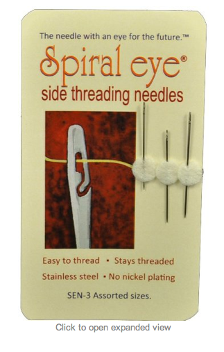 self-threading needle 1 self-threading needle 2The top kind, where you snap the thread into place, is a more reasonable cost, but occasionally it will shred your thread.  The side-threading needles retail for about seven dollars each (coming in a pack of three), but those who have them swear by them.  I did a search on “self-threading needle” on Google to find these.