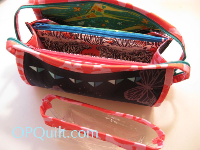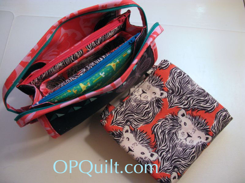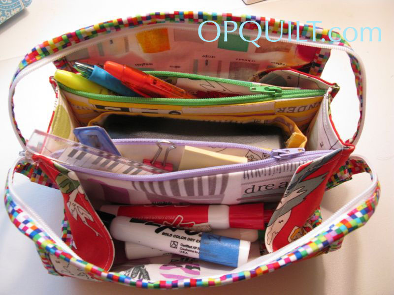 To keep my sew together bag clean, I made a clear vinyl pouch, sewing a self-binding fabric strip around the top to hold my eraser.  The dimensions were 7″ by 6 1/2″ of clear vinyl; sew two folded strips along the 7″ sides, then with WST, sew the side seams.  Yes, I did a tiny “boxing in” of the bottom corner to accommodate the eraser.
