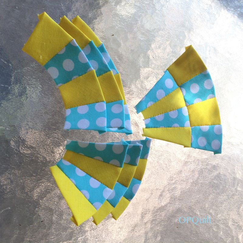 Stitch the upper row sections together, then the lower, then join them, keeping those seams aligned if at all possible.  Notice that I have not glued down the lower edges of the lower section to their papers (the innermost part of the circle), as I want to appliqué the center circle onto the piece, and it’s a lot harder if I’ve folded the edges and glued them down.