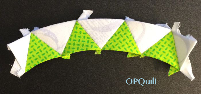 Then, line up four green triangles with their curved edges at the bottom, and the points that go in-between them (three pieces). Lastly, lay the half-triangle on each side.  NOW sew them together.  You don’t want to be sewing on a full-triangle on those outer edges; ask me how I know.