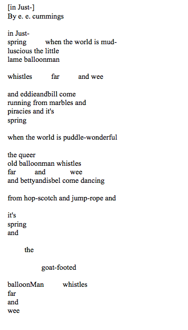 e.e. cummings’ poem appears on the surface to be a simple sensory poem about “when the world is puddle-wonderful” and “bettyandisbel come dancing / from hop-scotch and jump-rope.”  It’s a world where the wonders of childhood dominate, from mud, “piracies” and “marbles” to  the sight of a balloon man with his wares to sell to the children.