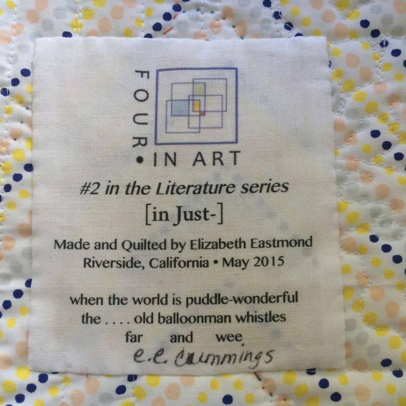 Continuing our theme of literature and my personal love of poetry, this is the second in a series of four art quilts for this year, a collaborative effort by the Four-in-Art Quilters, a name chosen because we do four small (12″ square) art quilts per year.  For this quarter, I chose e.e. cummings’ poem “[in Just-],” a poem about a balloon man selling balloons in Spring.  I’m also following a seasonal theme, as the last art quilt focused on Winter.