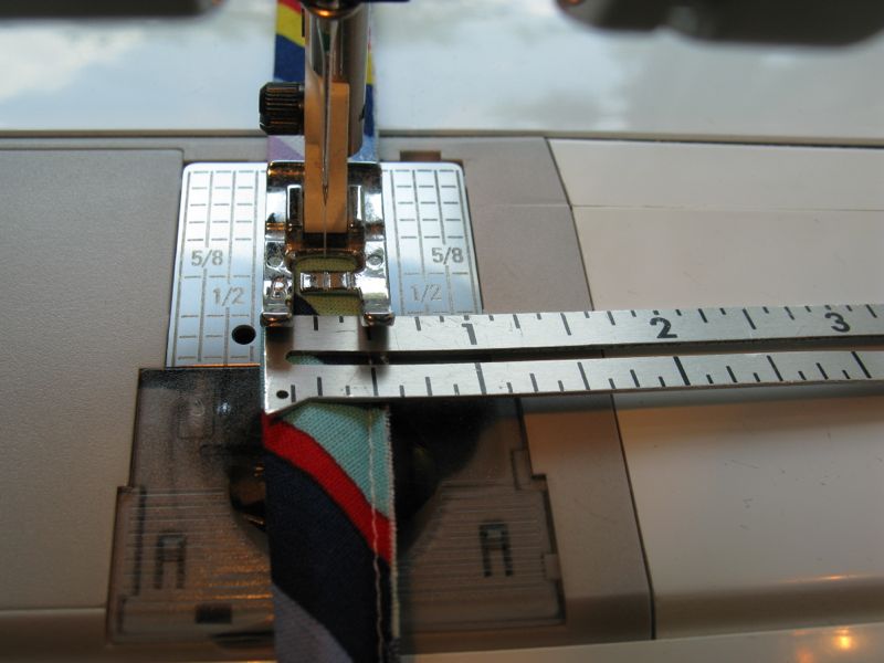 Follow the instructions for the bias strips for the bigger basket, but sew these narrower–about 3/8″ wide.  I’m using leftover handles strips for the big baskets. The woman who taught me this. in our Mt. Vernon Guild, made very narrow stems for her flowers by using this method.  So I call this the Narrow Stem Method.