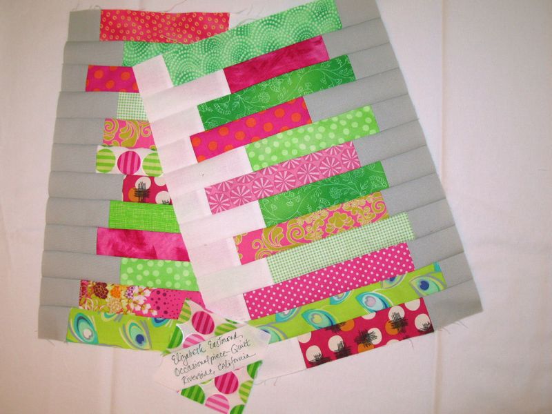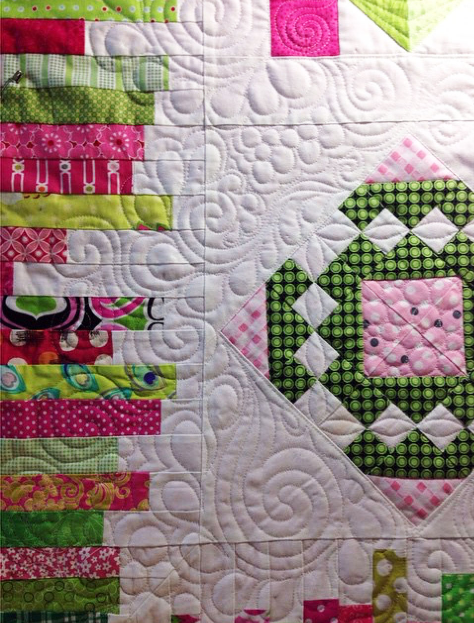 She also asked us for pink and green “bar” blocks, which she has now used to complete her “Strawberry Fizz and Lime Pop” quilt.