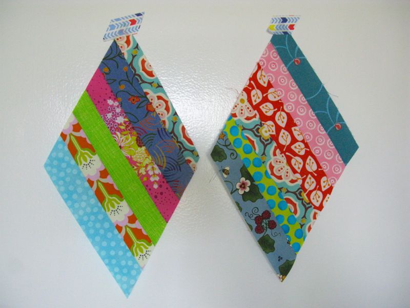 Linda of Flourishing Palms asked us for strip-pieced diamonds. The tricky part is to get the strips going the right way (trust me on this).