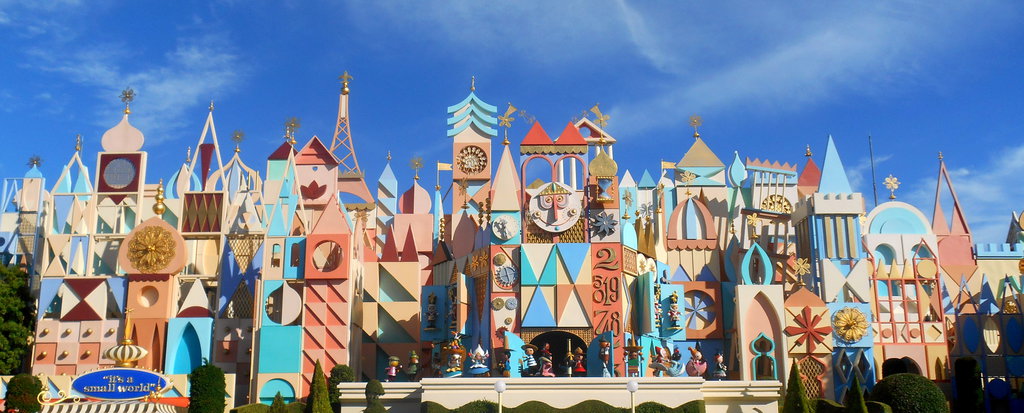 “Children of the World” was the working title of the attraction. Its tentative soundtrack, which can be heard on the album, featured the national anthems of each country represented throughout the ride all playing all at once, which resulted in disharmonic cacophony. Walt conducted a walk through of the attraction scale model with his staff songwriters Robert B. Sherman and Richard M. Sherman, saying, “I need one song that can be easily translated into many languages and be played as a round.” The Sherman Brothers then wrote “It’s a Small World (after all)” in the wake of the 1962 Cuban Missile Crisis, which influenced the song’s message of peace and brotherhood. When they first presented it to Walt, they played it as a slow ballad. Walt requested something more cheerful, so they sped up the tempo and sang in counterpoint. Walt was so delighted with the final result that he renamed the attraction “It’s a Small World” after the Sherman Brothers’ song.” (Wikipedia)