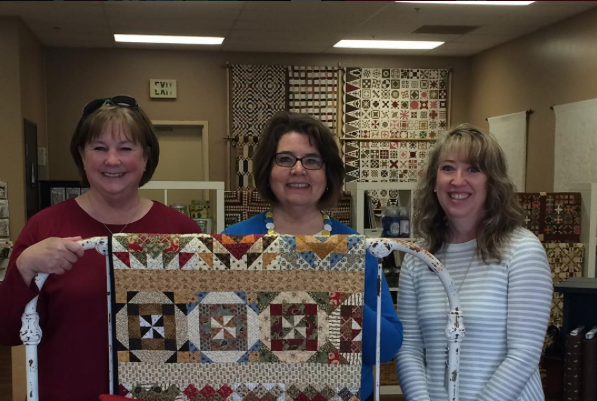 Saturday, Sherri and Laurel (one of the Good Heart Quilters) and I did a mini shop-hop, hitting three stores in the Temecula area, and enjoying lunch at a local Mexican restaurant.  We were buying wool for their Oh Christmas Tree QAL, which begins next week in earnest (so I hope you are all getting your supplies, too).  If I look funny, it’s because I was standing on my tiptoes to see over the high rails of the antique bed I was posing in front of. Plus I’m really tired from too much fun seeing the quilts.