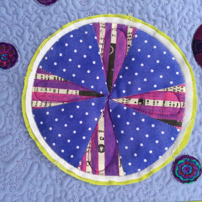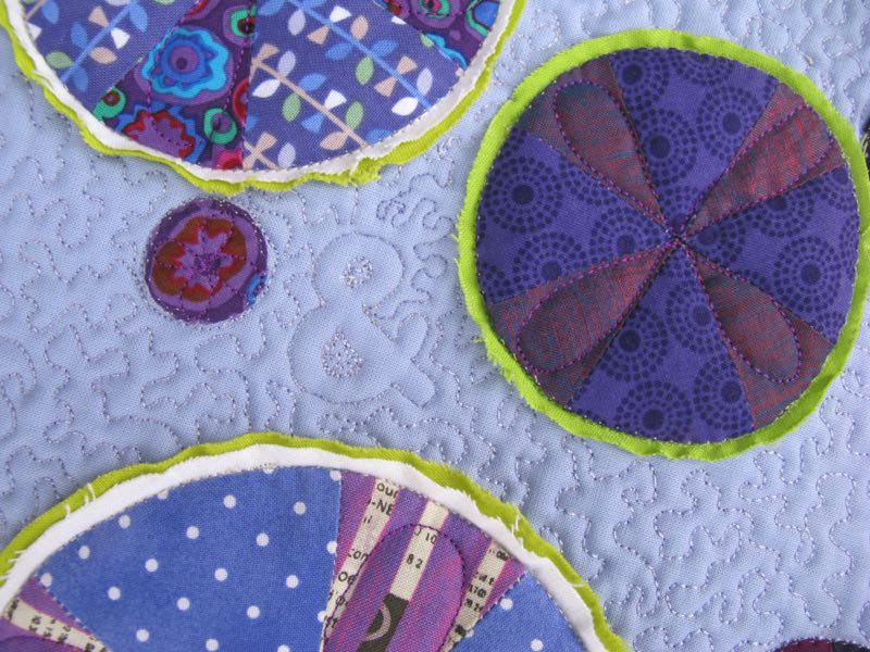 I constructed the bit I wanted to by paper piecing, then plain-old-pieced the rest. I stitched it to a white square, then a chartreuse square, as the purple was just lost on the quilt, plus it imitated the circle around the molecule. I made different sizes of different fabrics, then finally, small circles. Then came the arranging: