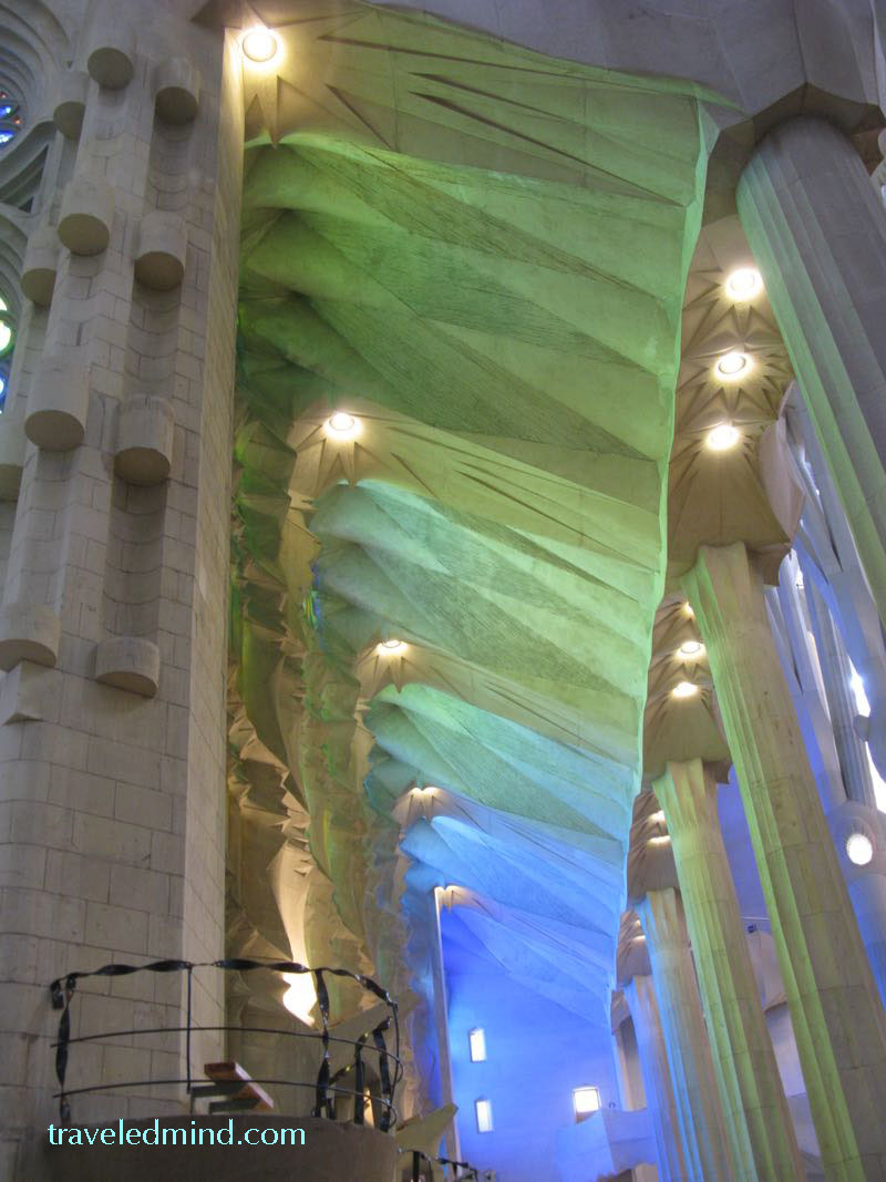 It’s hard to believe that just over two weeks ago, I was sitting in La Sagrada Familia in the center of the nave (they’d roped off the center section to protect it from the crowds), seated quietly, soaking up the colors and sights and sounds that were swirling around me.  Aside from the two gorgeous choir lofts shown here, there are all kinds of stained glass windows, interesting sculptural features, an inspiring Christ under a unique baldacchino.  As I sat there, just under the hub-bub of the tourists milling all around me,  I became aware of choral music.  Strains of it reminded me of Faure’s Requiem.  At other times I thought I could float along on the melody of Ave Maria.  Then I was sure Handel’s Messiah was the melody I was hearing.  It was all very ethereal, a peak Easter experience for me.