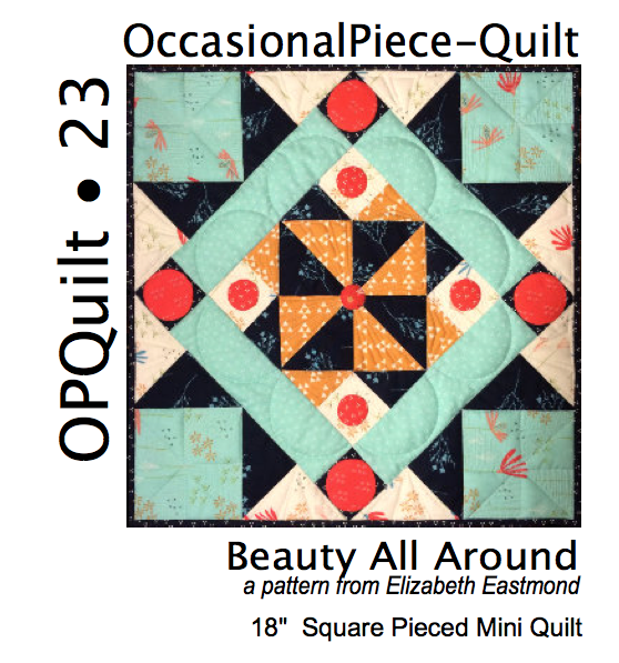 Before I start on my market wrap-up posts (although Sherri of A Quilting Life has a nice array of photos of her Moda contemporaries), I wanted to show you some of the market sewing I did for Sherri. She sent me some fabrics, I sent her an email with a design, then I got to work creating this little mini for her Moda booth. She has the words “There is Beauty All Around” on the selvage of her one of her fabric lines, so I grabbed a bit of that for a title. I got it wrong initially, thinking it belonged to this line, Desert Bloom, but it belonged to the previous collection.