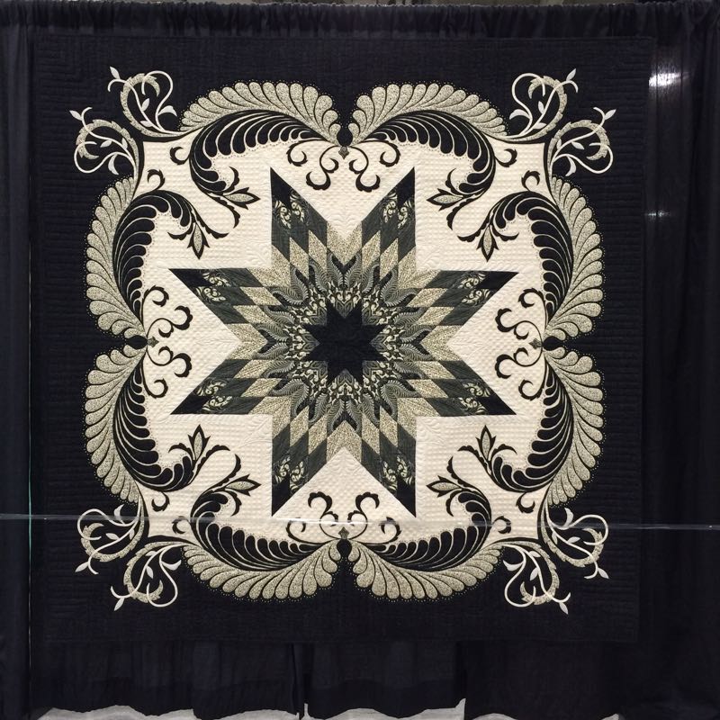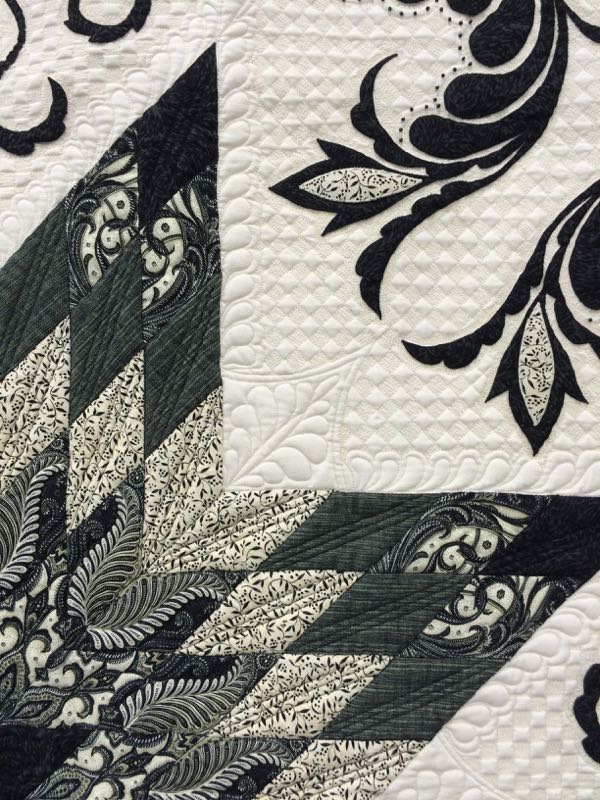 Ravendale Star, by Linda Fleschner, is a quilt where she did not design the entire thing before she started but knew that she would “use the Ravendale paisley print in a Radiant Star.”  She goes on to say, “When that was finished, I designed the border feather, staying with a black and white palette–a big departure from the bright colors I normally use.”QMFleschner_RavendaleStar2 QMFleschner_RavendaleStar3
