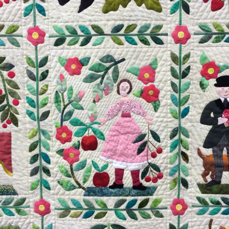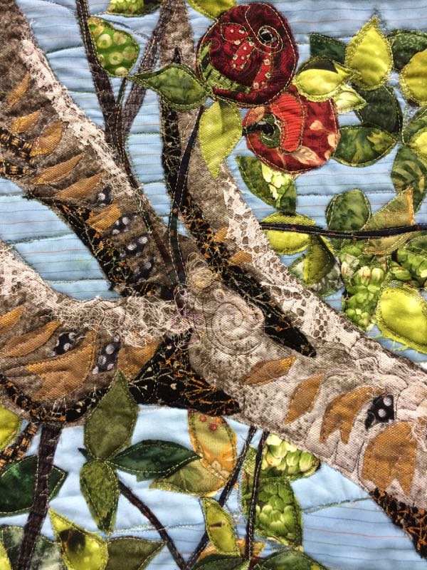 Arroyo Grande Album is by Andrea Perejda.  She writes: “Folk-art appliqué has been an interest of mine for many years.  I started with Threadbear’s pattern for their Civil War Bride quilt top.  I altered it considerably, adding personally meaningful motifs and appliqué sashings.”QMPerejda_ArroyoGrandeAlbum2 QMWasilowski1_birdonbranch