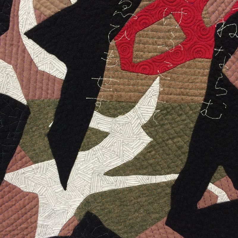 Why Knot? is by Tanya Brown, who writes: “This quilt was inspired by watching my Cub Scout son practice knot tying, an exercise designed to torment the uninitiated.  In this piece, the metaphorical nightmare of becoming hopelessly engulfed in one’s own knots is made real.”  Follow the link on her name to read her (hilarious) description of how this piece came to light, as well as interesting reading on her process.
