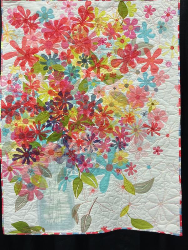 Exuberance, by Enid Gjelten Weichselbaum, was “[i]spired by the layering of colors created in watercolor paintings.”  She “used layers of bright organzas to ‘grow’ a joyful bouquet of flowers and a transparent vase.QMWeichselbaum_Exuberance2