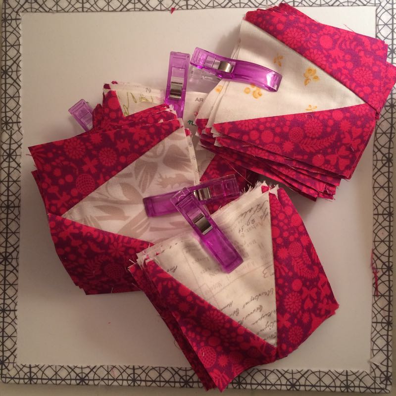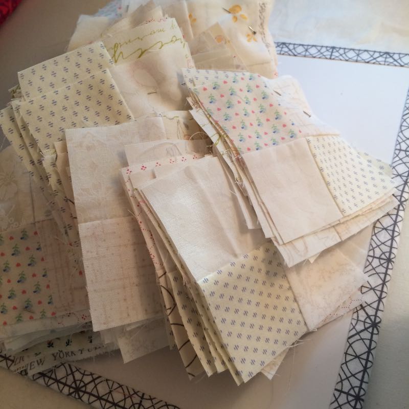 Part one of the En Provence Mystery Quilt asked us to make 221 of these four-patch groups.  I was able to make 207, and will find the time to make the others in the future.en-provence_2