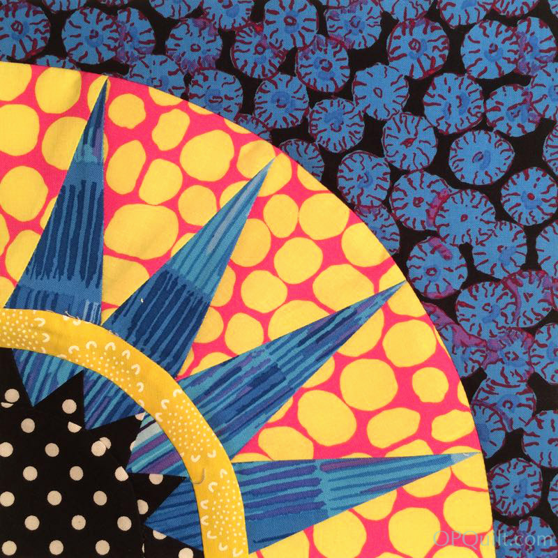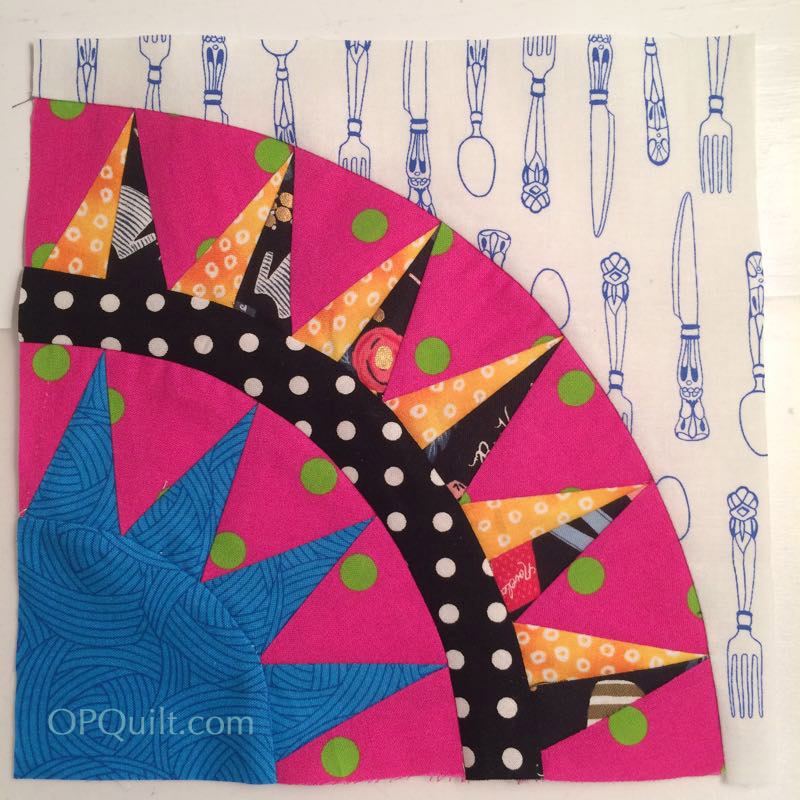 3. Love the fabrics and the variety. The result should be beautiful. One tip I’ve found useful for getting the stripes oriented so they point straight out is to precut the end shape (i.e. the triangle), slightly oversize. Then you can align the seam allowances in the usual manner. I also use Judy Mathieson’s method of folding back on the seam line ‘to be sewn’. The space to be covered lies under the new piece you are trying to align and with a little light behind, you can see the lines and see that you are centered properly. Thanks.