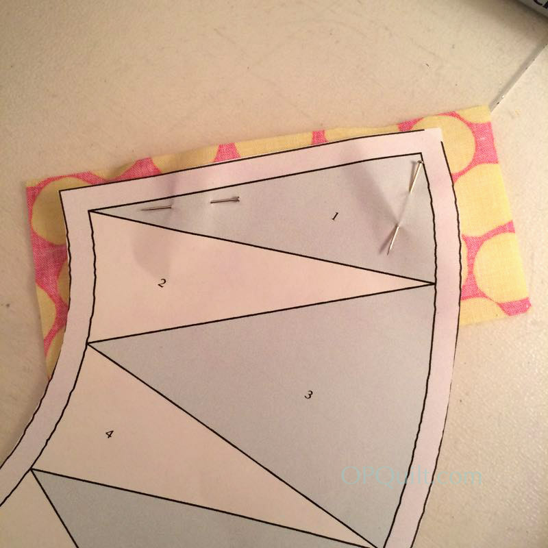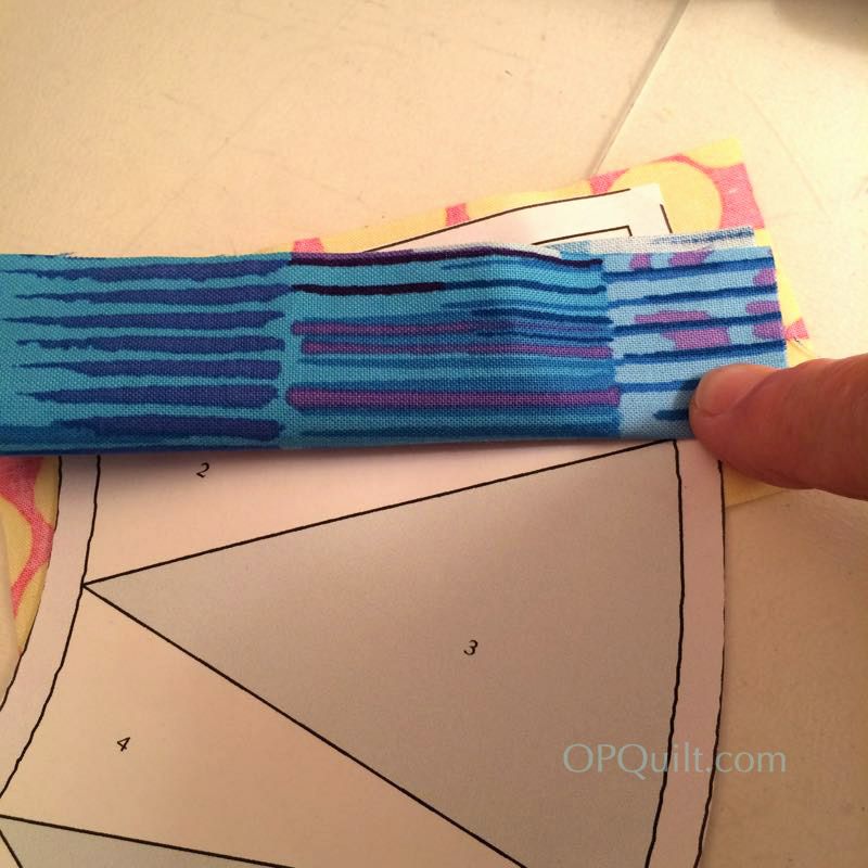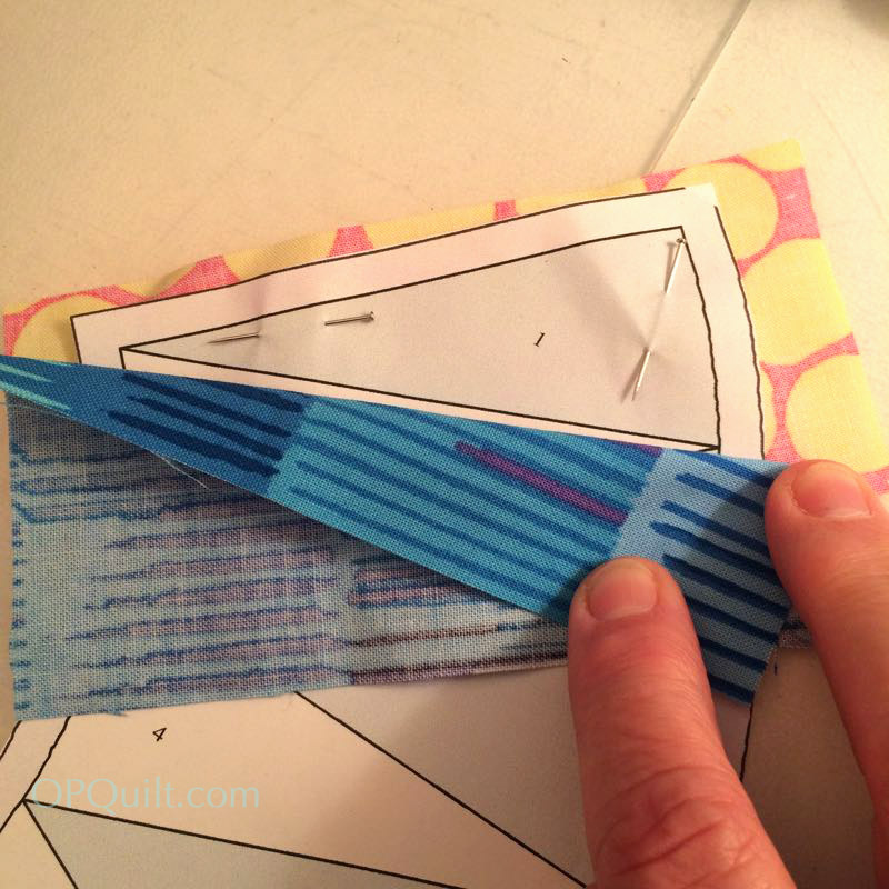 The second block had another challenge.  If you go and look at it, you can see I was using striped material, and I didn’t want that stripe to tilt.  First piece on (above), and I don’t glue my foundation paper piecing, I pin.