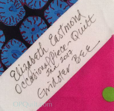 We make each other signature blocks, using a white 3 1/2″ square and snowball on two 2-1/2″ squares on either corner, using fabric from the blocks we made. (Click on the link to see a how-to, as well as how we’ve used our signature blocks: sometimes on the back and sometimes on the front of the quilt!)