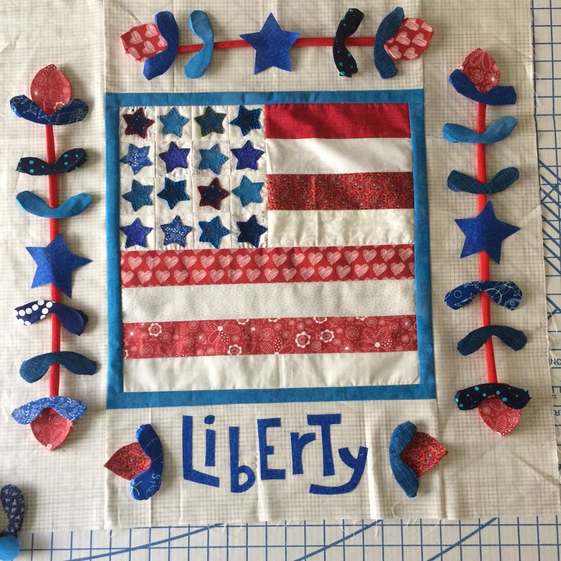 I laid out all the parts: leaves, byds (small and large), tubing for stems and more cut stars (on the pattern sheet), trying to decide if I like two leaf sets next to the word Liberty, or one. I’ll appliqué or blanket stitch down everything…then decide. Since I work in small segments of time, and ever so slowly, I might make my goal of July 4th. Here’s the pattern sheet in a PDF document: liberty-usa-quilt-bits