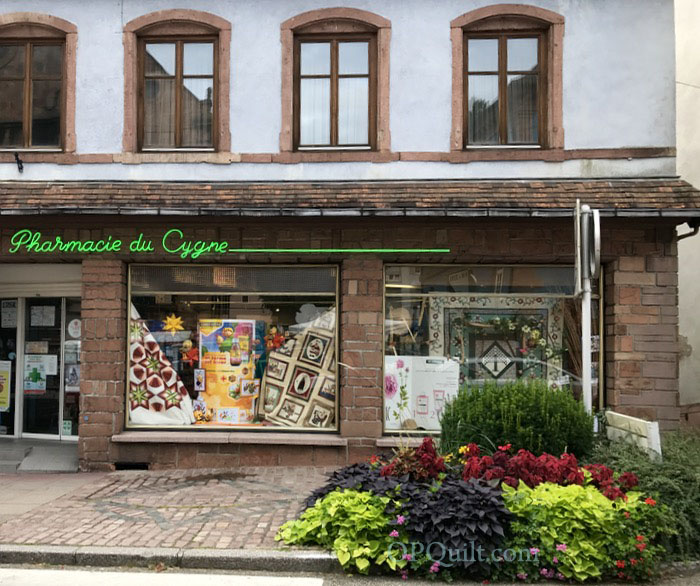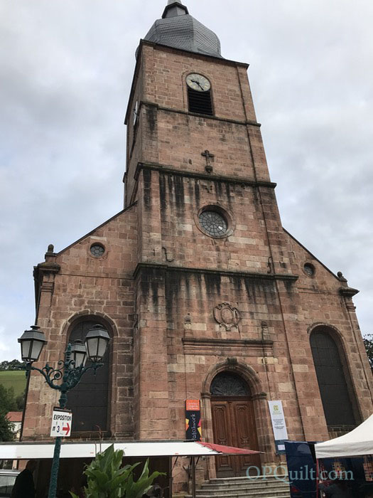 The Patchwork Meeting was about 4 hours from Geneva, so my husband and I drove most of the way, breaking our journey in Mulhouse, France, where we stayed overnight. We drove the rest of the way Saturday morning and arrived in St. Marie-aux-Mines about 9:10 a.m. [Roxanne and her husband went separately.] We were so early, we found a great parking place. Above are scenes from the village. It rained off and on that day, which was too bad for the vendors, but we did our part (insofar as my suitcase could accommodate–see next post).