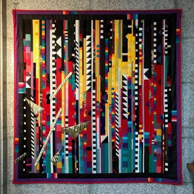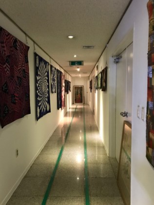 The Chojun Textile and Quilt Art Museum wasn’t too far from our hotel, up a narrow street, and it is very small: a room for the entry, a side room for the gift shop and more, a hallway and a one-room display. Right off the bat, we see Yvonne Porcella’s quilt hanging up on the right side of the display room. When we were talking about it, the assistant curator, Jeehye OK, who spoke English and was a good guide and help, lifted it up to see if there was a label. There wasn’t, but instead a hand-written note on the rod pocket: “Top.” The quilt was displayed upside-down, but apparently the curator likes it that way. I wondered if it were because of the way language functioned in Korea until the early 1990s: written right to left, but I’ll never know.