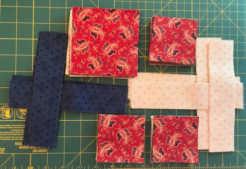 But here is your caution: The strips, above, are the dark borders and the light borders. THE DARK BORDER IS SUPPOSED TO BE WIDER. Okay, there’s my oops. I liked the look of the wider border, so after piecing as instructed (see below), I sewed another coordinating strip onto the blue to bring it wider. I didn’t have any of this fabric, but did have some navy “primitive” fabric, and it worked okay.