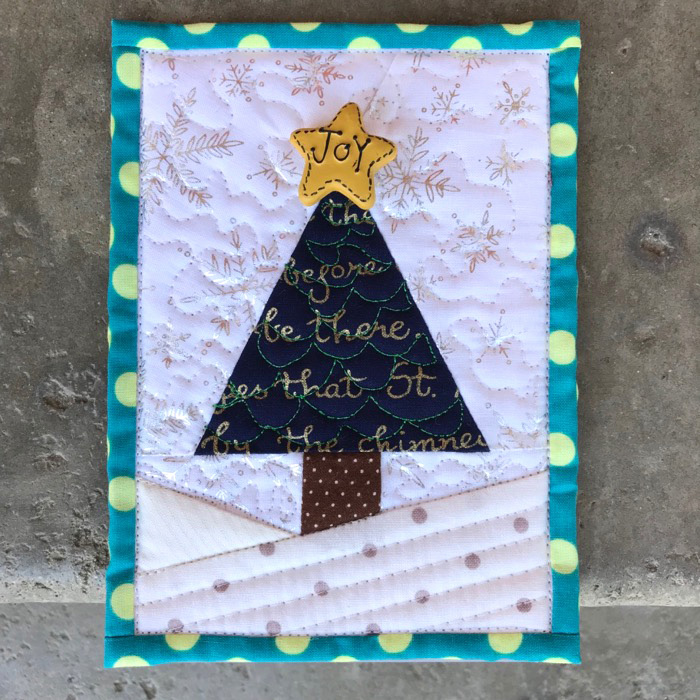 It slips over the back of one of those cheezy plastic stand picture frames (under 2 bucks at Walmart). [More on the quilt underneath it at the end of the post.]