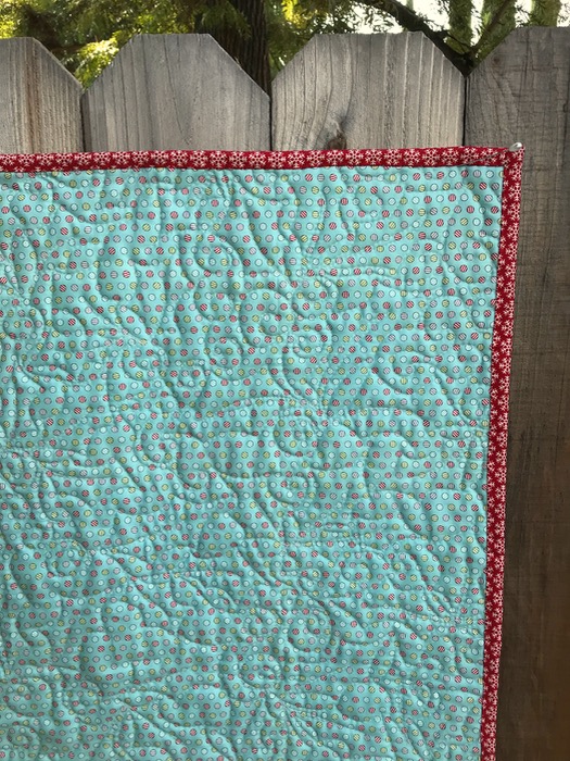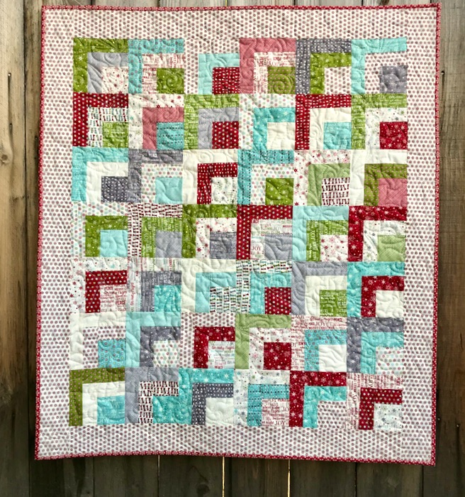 And if you answered “Christmas!!” in response to the prompt, you — unfortunately — are also correct. So to take photographs of Frivols #10 finish, done up in a Sweetwater Christmasy line of fabrics, I headed to Costco for the photo shoot. I’m calling it Christmas Corner, because all those quarter log-cabin shapes remind me of street corners.
