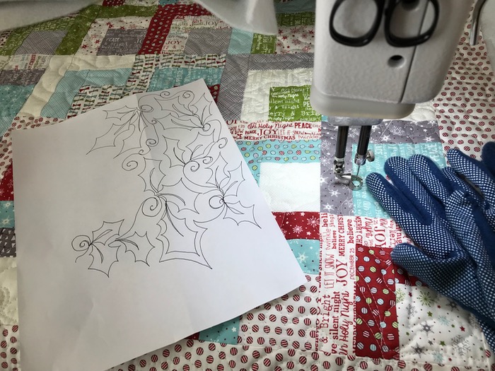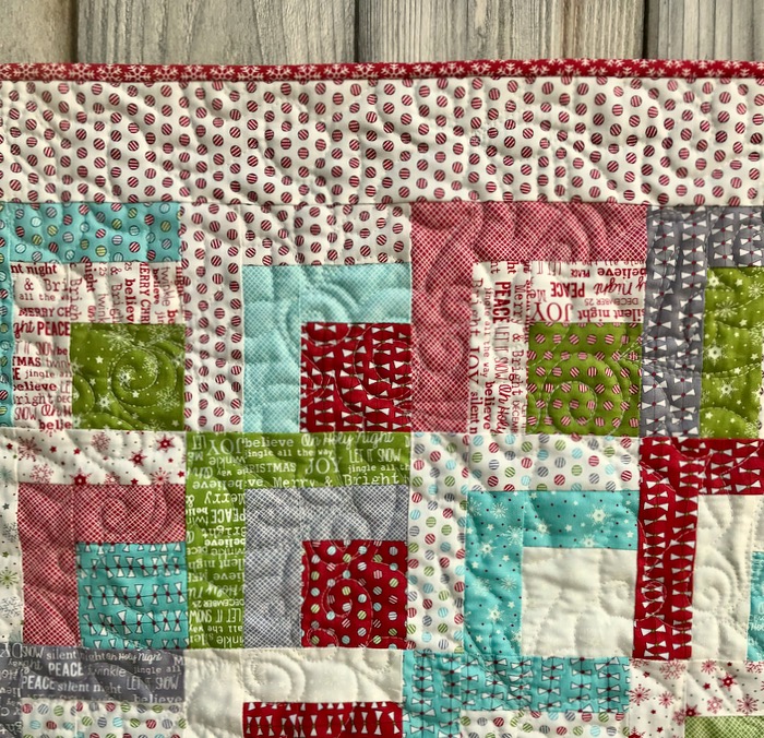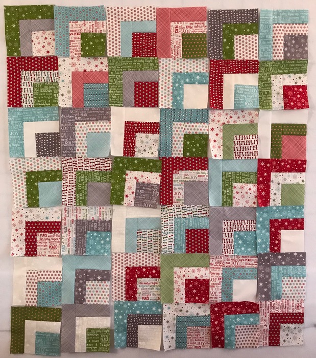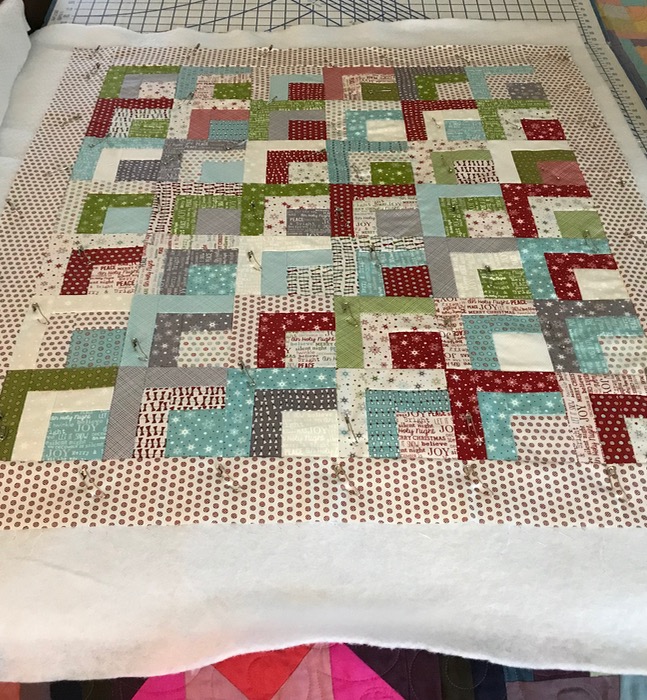 Here are the finishing up photos for this little quilt, finishing at 32″ by 36″: arranging the quarter-log cabin square, pinning, then quilting it. I didn’t have any red fabric for the binding, but in my Christmas bin, found a piece of an earlier Sweetwater Christmas line, and yes–it works quite well.