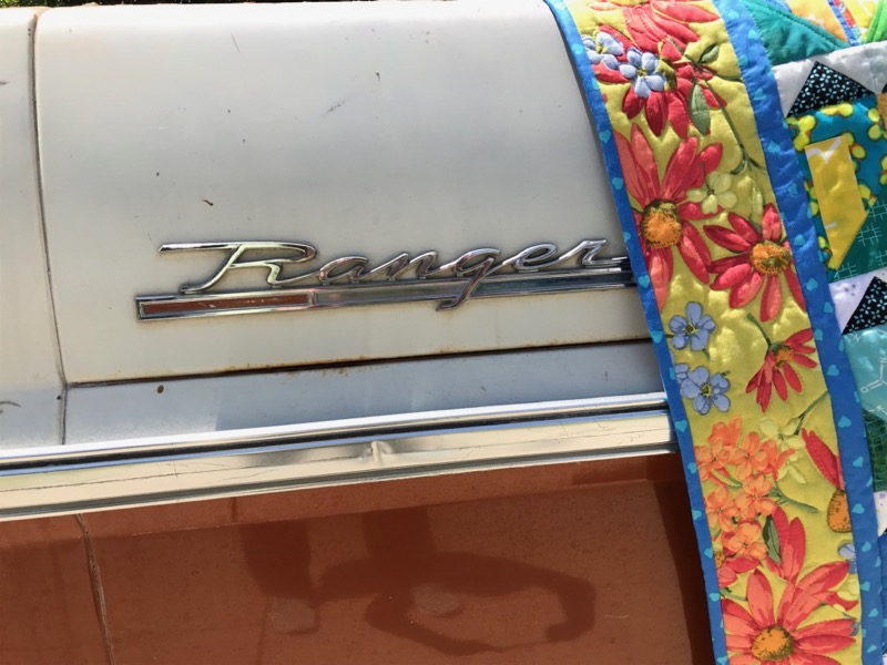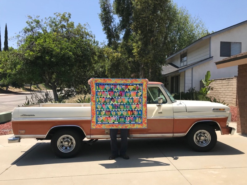 The photograph on the truck?  It went like this: on our way to get some Vietnamese bùn châ for lunch, we trekked down to our newest neighbors’ home to ask if we could please pose the quilt on their cool car, and so I knocked on their door and it opened to a crying baby in the other room and a smiling baby in his father’s arms and good-natured parents, owners of a new-to-them truck and the mother’s name was Genesis and the father’s name was Nate and we introduced ourselves and they said yes, of course, and then they headed back inside because it was about a hundred degrees outside, as they smiled and waved and shut the door behind them, the  lovely music of a home with a young family and a Ford Ranger just made for quilt posing.