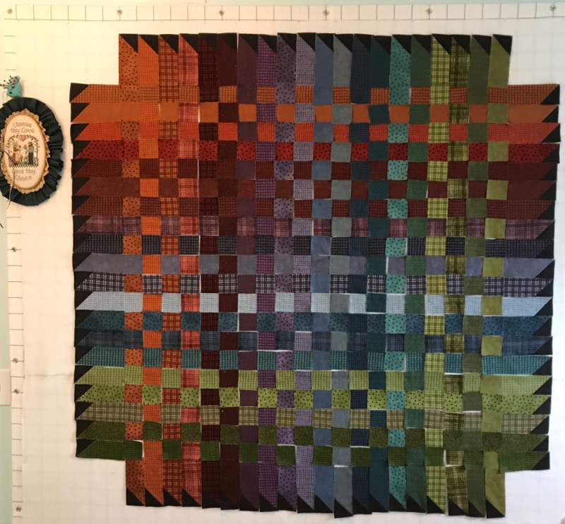 So December 8th, I cut the bazillion little squares from a jelly roll then lost my mind once or twice trying to get it up on the design wall. (Yes, that little stitchery does say “Choose thy Love…Love thy Choice.” It’s from my cross-stitch days and I still believe in the saying.)