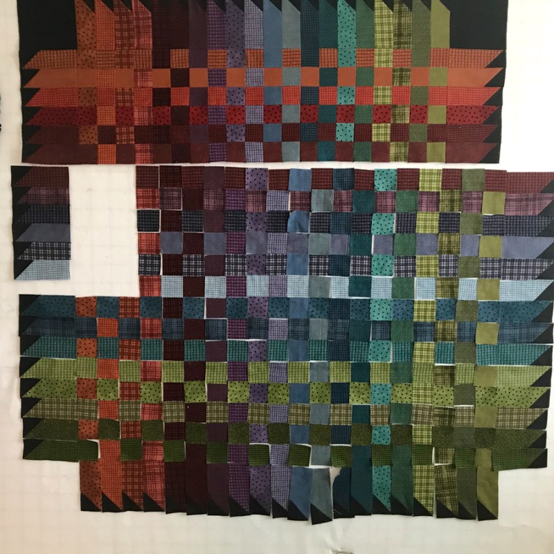 How to sew this together? I decided to do it in nine-patches, and then sew the outer rectangles together. I listened to audiobooks, kept sewing.