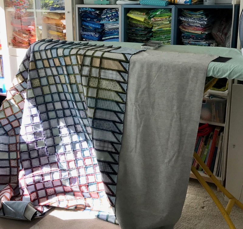 Here is the finished product, about 85″ high, 65″ wide. I ran it through the washer and dryer to crinkle it up a little bit before giving it to him. Merry Christmas, Dave!