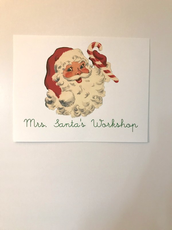 But luckily the hard work of piecing was over, so I sewed a great large swath of the border fabrics on the sides, top and bottom, then moved the Mrs. Claus sign over to our guest bedroom, also known as the Quilting Room. I pinned it all together on my kitchen counter, took it back upstairs and went to town on the quilting. One long day later it was done. I chose to do a very large meander on it, because I wanted it to feel soft and snuggly, and I knew that loosely quilted quilts feel that way.
