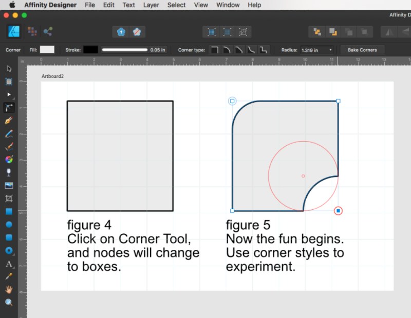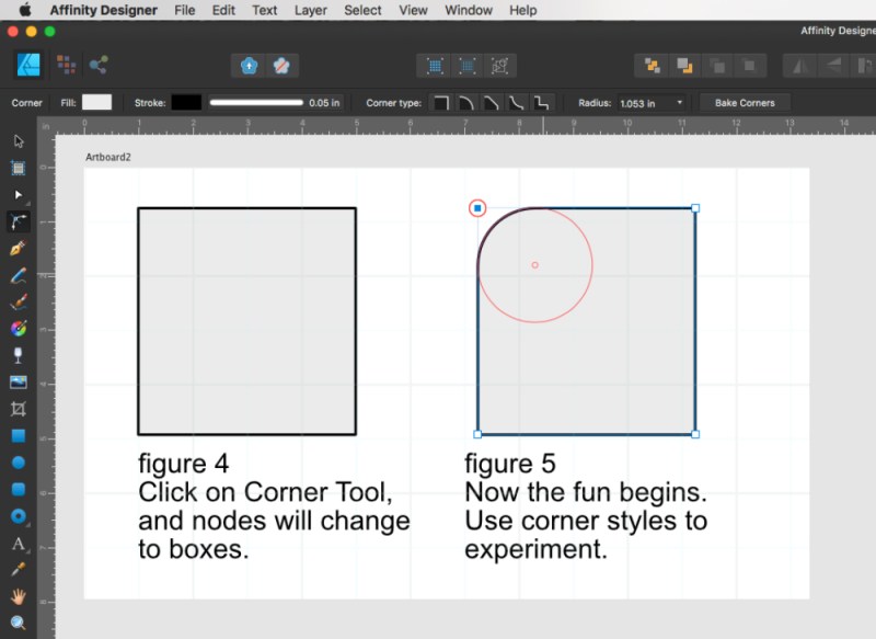 Click on the corner tool (in the pink circle) and the nodes will change to little boxes. Right by them, not really visible in his illustration is a small red “handle” that you’ll grab. Move your cursor around to locate it for one corner, then drag toward the center of the square.