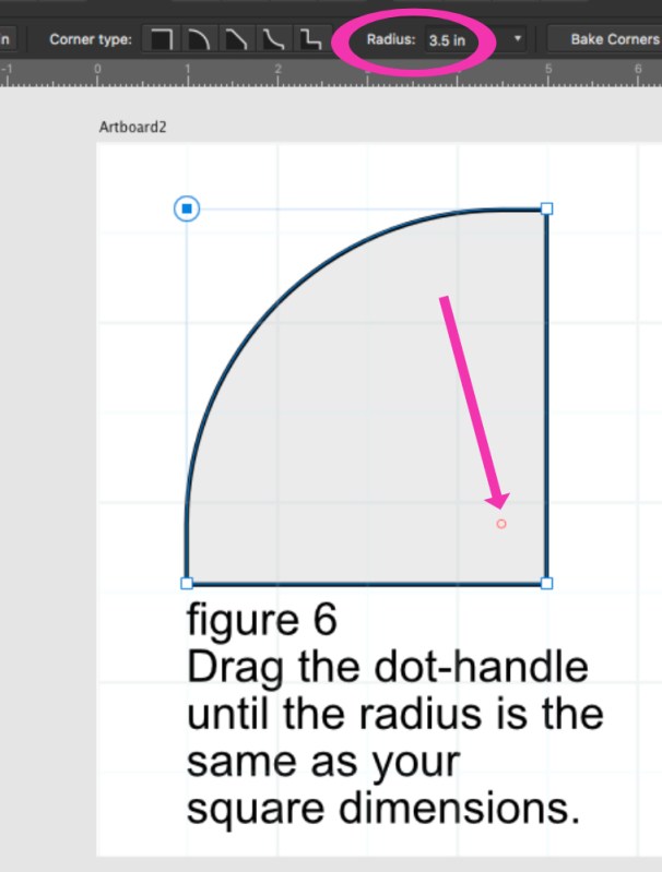 But I really want to make a petal-shape. I dragged the handle until the radius was the same as the square’s side: 3 1/2″ inches. I kept my eye on the measurements, shown in the pink oval.