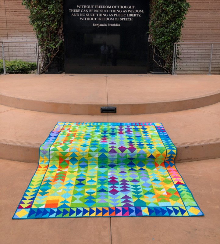 The quilt and I on a windy day at City Hall, Riverside, California.